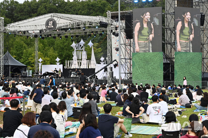 [수원=뉴시스] 김종택 기자 = 2025 수원재즈페스티벌 둘째날인 20일 오후 경기 수원시 광교호수공원 재미난 밭에 마련된 무대에서 노드 밴드가 열띤 공연을 펼치고 있다. 2025.09.20. [email protected]
