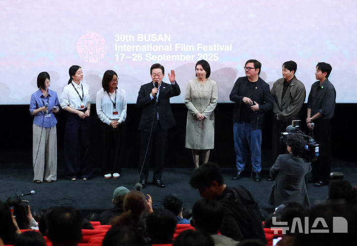 [부산=뉴시스] 최동준 기자 = 이재명 대통령이 20일 부산 해운대구 영화의전당에서 부산국제영화제 공식상영작 '극장의 시간들'을 관람한 뒤 인사말을 하고 있다. (대통령실통신사진기자단) 2025.09.20. [email protected]