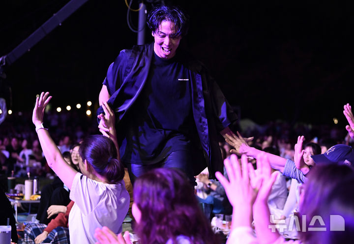 [수원=뉴시스] 김종택 기자 = 2025 수원재즈페스티벌 둘째날인 20일 오후 경기 수원시 광교호수공원 재미난 밭에 마련된 무대에서 힙합 프리스타일 댄서 제이블랙이 열띤 공연을 펼치고 있다. 2025.09.20. [email protected]