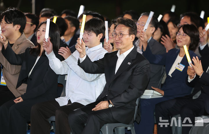 [서울=뉴시스] 청사사진기자단 = 김민석 국무총리가 20일 오후 서울 종로구 청와대 녹지원에서 열린 2025 청년의 날 기념식에서 응원봉을 흔들며 공연을 관람하고 있다. 2025.09.20. [email protected]