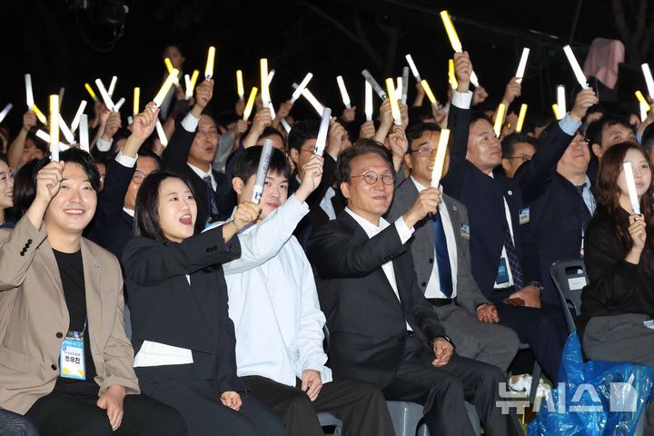 [서울=뉴시스] 청사사진기자단 = 김민석 국무총리가 20일 오후 서울 종로구 청와대 녹지원에서 열린 2025 청년의 날 기념식에서 청년들과 함께 응원봉을 흔들고 있다. 2025.09.20. [email protected]
