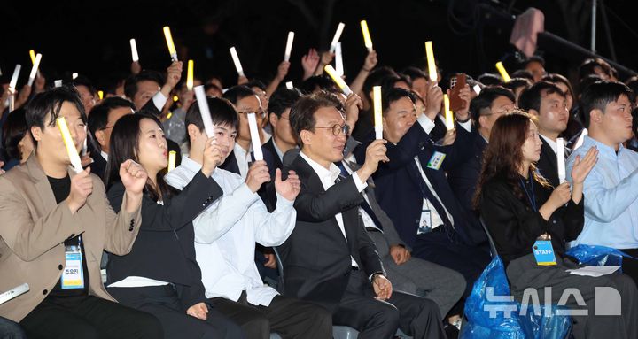 [서울=뉴시스] 청사사진기자단 = 김민석 국무총리가 20일 오후 서울 종로구 청와대 녹지원에서 열린 2025 청년의 날 기념식에서 청년들과 함께 응원봉을 흔들고 있다. 2025.09.20. [email protected]