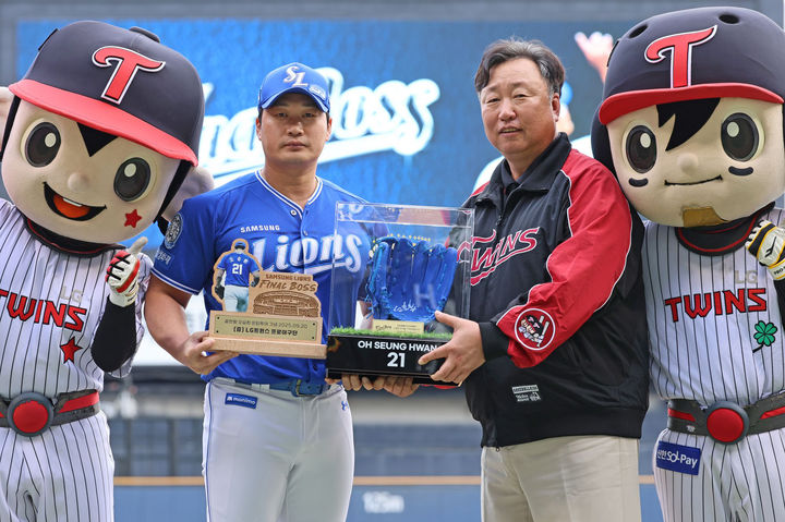 [서울=뉴시스] 조성우 기자 = 삼성 라이온즈 오승환이 20일 서울 송파구 잠실야구장에서 열린 삼성 라이온즈와 LG 트윈스와 경기에 앞서 열린 은퇴 투어 행사에서 차명석 LG 단장으로부터 목각 기념패와 기념 글러브를 받고 있다. (사진=삼성 라이온즈 제공) 2025.09.20. [email protected] *재판매 및 DB 금지