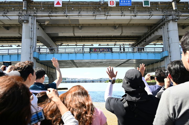 [서울=뉴시스] 휴일 한강버스에 오른 시민들이 반포대교 아래를 지나며 다리 위 시민들과 손을 흔들며 즐거운 시간을 보내고 있다. 2025.09.21. (사진=서울시 제공)