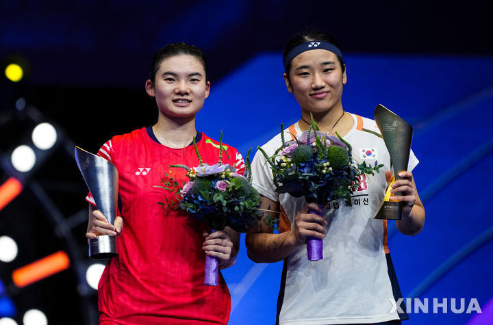 [선전=신화/뉴시스] 안세영(1위, 오른쪽)이 21일(현지 시간) 중국 광둥성 선전 아레나에서 열린 '2025 세계배드민턴연맹(BWF) 리닝 중국 마스터스(슈퍼750) 여자 단식 정상에 올라 트로피를 들고 한웨와 함께 기념 촬영하고 있다. 안세영은 결승에서 한웨(3위·중국)를 33분 만에 2-0(21-11 21-3)으로 꺾고 대회 2연패를 달성했다. 2025.09.21.