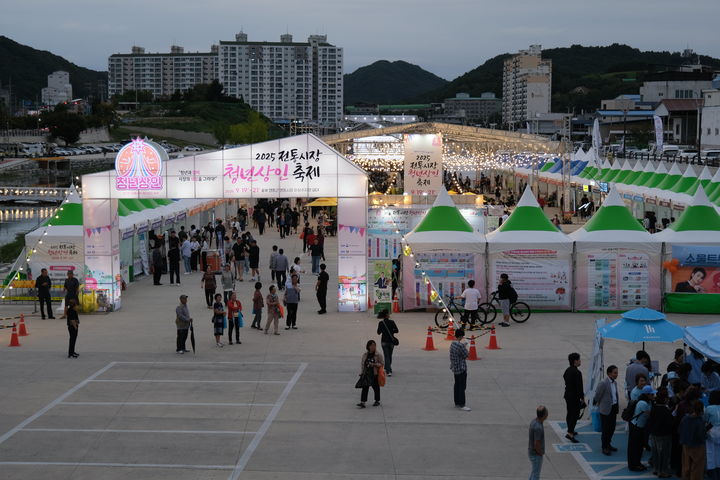 [영동=뉴시스] 전국 각지의 젊은 자영업 종사자들이 19일부터 충북 영동군 영동읍 영동시장 하상주차장에서 벌인 ‘2025전통시장 청년상인축제’가 21일 오후 막을 내리고 있다. 중소벤처기업부가 주최하고 소상공인시장진흥공단이 주관하고, 영동군이 후원한 이 축제에서 청년 상인들은 특색 있는 70여 개 먹거리·판매·체험·수제맥주·이벤트 부스를 차려놓고 손님을 맞았다. (사진=영동군 제공) 2025.09.21. [email protected]