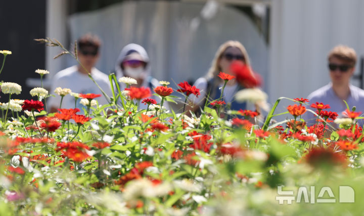 [서울=뉴시스] 김명원 기자 = 완연한 가을 날씨를 보인 21일 오전 서울 종로구 열린송현 녹지광장에 나들이 나온 시민들과 관광객들이 가을 맞이 꽃길 산책을 하고 있다. 2025.09.21. [email protected]