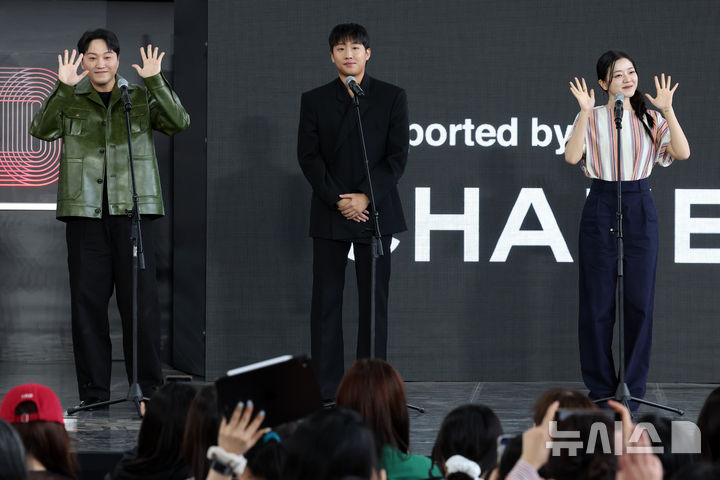 [부산=뉴시스] 박진희 기자 = 영화 '극장의 시간들' 배우 김대명, 홍사빈, 고아성이 21일 부산 해운대구 영화의전당 BIFF 야외무대에서 제30회 부산국제영화제 무대인사를 하고 있다. 2025.09.21. [email protected]
