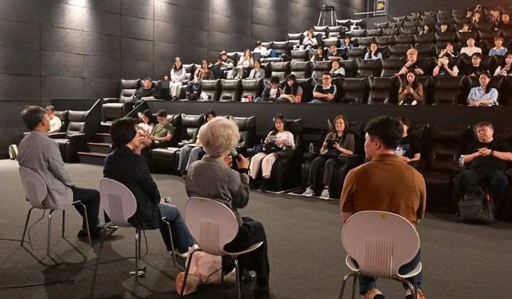 [서울=뉴시스] 전진환 기자 = 제30회 부산국제영화제에 초청된 독립 다큐 영화‘빨간나라를보았니”의 홍영아 감독, 출연진이 지난 19일 관객과의 대화를 하고 있다.  ‘빨간나라를보았니’는 경상북도에서 파란 잠바를 입고 선거에 뛰어드는 이들의 선거 패배기를 다룬 독립 다큐다. (사진=사려니필름 제공) 2025.09.21. [email protected] *재판매 및 DB 금지