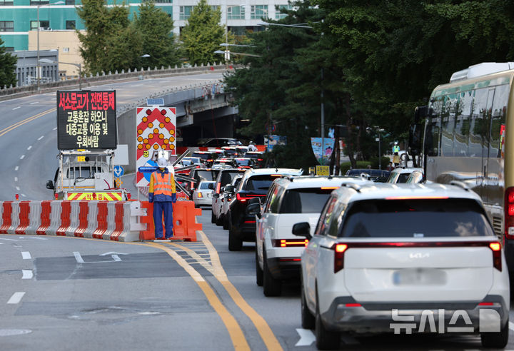 [서울=뉴시스] 황준선 기자 = 21일 서울 중구 서소문 고가차도의 차량 통행이 전면 통제되고 있다.