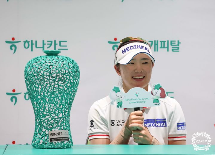 [서울=뉴시스] 정병혁 기자 = 21일 인천 청라 베어즈베스트 청라GC에서 열린 '하나금융그룹 챔피언십' FR에서 우승을 차지한 이다연이 미디어 인터뷰에서 답하고 있다.(사진=KLPGA 제공) 2025.09.21. [email protected] *재판매 및 DB 금지