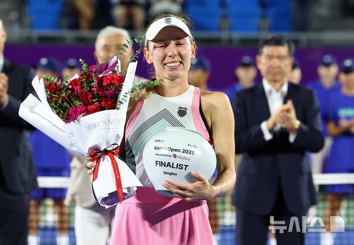 [서울=뉴시스] 최진석 기자 = 21일 서울 올림픽공원 테니스장에서 열린 2025 여자프로테니스(WTA) 투어 코리아오픈 단식 결승 이가 시비옹테크(폴란드)와 에카테리나 알렉산드로바(러시아)의 경기에서 패하며 준우승을 차지한 알렉산드로바가 트로피를 들고 있다. 2025.09.21. [email protected]