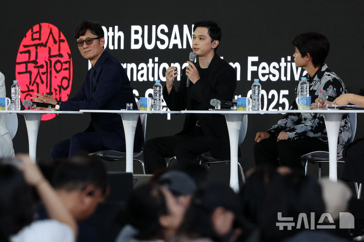 [부산=뉴시스] 박진희 기자 = 영화 '국보'의 이상일(왼쪽부터) 감독과 배우 요시자와 료, 쿠로카와 소야가이 21일 부산 해운대구 영화의전당 BIFF 야외무대에서 제30회 부산국제영화제 오픈토크를 하고 있다. 2025.09.21. [email protected]