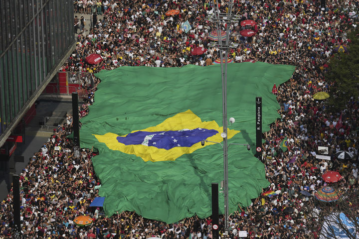 [상파울루=AP/뉴시스] 21일(현지 시간) 브라질 상파울루에서 자이르 보우소나루 전 브라질 대통령과 그의 측근을 사면할 수 있는 법안에 항의하는 시위대가 대형 국기를 들고 있다. 보우소나루 전 대통령은 쿠데타 모의 등의 혐의로 27년형이 선고된 바 있다. 2025.09.22.