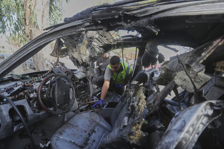 [빈트즈베일=AP/뉴시스] 22일(현지 시간) 레바논 남부 빈트즈베일에서 민방위대원들이 이스라엘의 드론 공격으로 일가족이 숨진 차량 피해 현장을 점검하고 있다. 현지 언론은 전날 이스라엘 무인기가 자동차와 오토바이 등을 공격해 어린이 3명 포함 8명이 숨지고 2명이 부상했다고 전했다. 이스라엘군(IDF)은 이번 공격이 헤즈볼라를 겨냥한 것이었으나 민간인 사상자가 발생한 것에 대해서는 유감을 표했다. 2025.09.22.