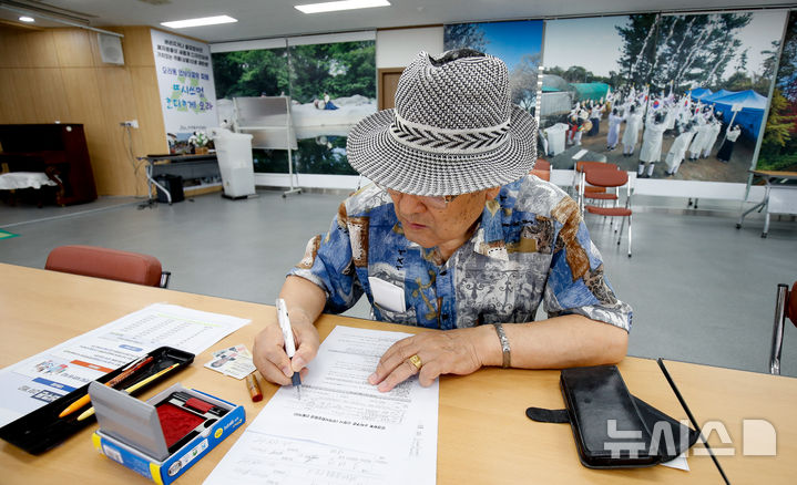 [제주=뉴시스] 우장호 기자 = 민생회복 소비쿠폰 2차 지급 신청 첫날인 22일 오전 제주시 오라동 주민센터를 찾은 시민이 신청서를 작성하고 있다.