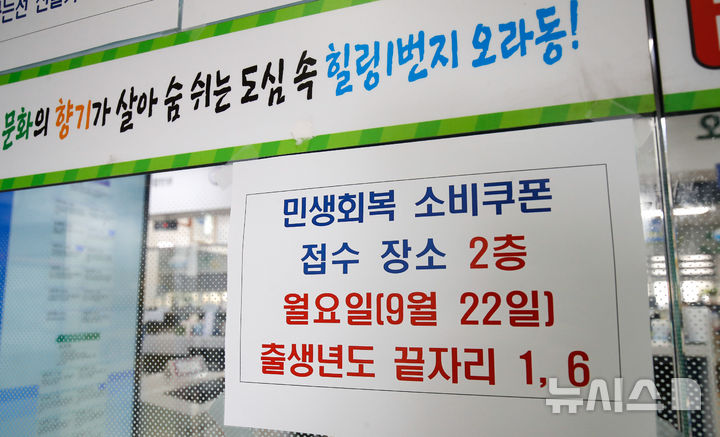 [제주=뉴시스] 우장호 기자 = 민생회복 소비쿠폰 2차 지급 신청 첫날인 22일 오전 제주시 오라동 주민센터 정문에 출생년도 끝자리 1, 6 신청 안내문이 붙어 있다.