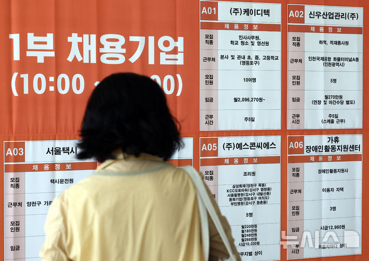 [서울=뉴시스] 박주성 기자 = 22일 서울 양천구 해누리타운에서 열린 2025 하반기 일자리 박람회 '더! 잡다(Job多)'에서 구직자들이 채용 게시대를 보고 있다. 2025.09.22. [email protected]