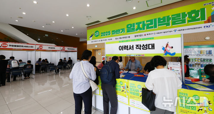 [서울=뉴시스] 박주성 기자 = 22일 서울 양천구 해누리타운에서 열린 2025 하반기 일자리 박람회 '더! 잡다(Job多)'에서 구직자들이 이력서를 작성하고 있다. 2025.09.22. [email protected]