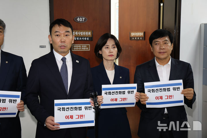 [서울=뉴시스] 김명년 기자 = 김용민 국회 법제사법위원회 더불어민주당 간사 등 의원들이 22일 오전 서울 여의도 국회 법사위 전체회의가 정회된 후 나경원 의원을 비판하는 내용의 기자회견하고 있다. 2025.09.22. [email protected]