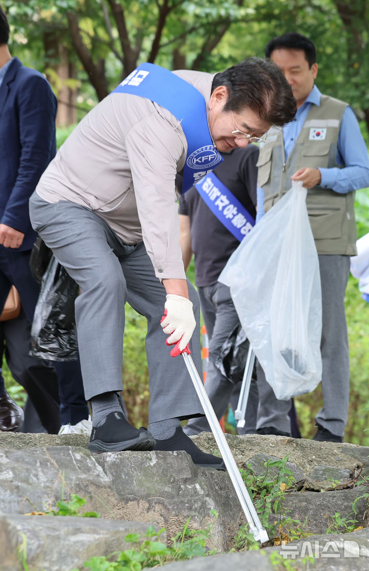 [서울=뉴시스] 권창회 기자 = 강석호 한국자유총연맹 총재가 22일 오후 서울 마포구 홍제천 수변무대에서 열린 APEC 성공 기원 대한민국 새단장 캠페인에서 플로깅을 하고 있다. 2025.09.22. [email protected]
