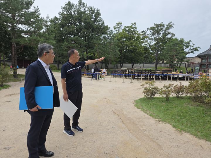 [서울=뉴시스] 허민 국가유산청장이 22일 서울 종로구 경복궁에서 고궁음악회 무대 설치 및 준비 상황을 점검하고 있다. (사진=국가유산청 제공) 2025.09.22. [email protected] *재판매 및 DB 금지