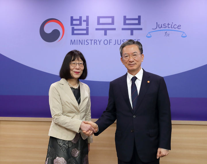 [서울=뉴시스] 정성호 법무부장관이 22일 정부과천청사 법무부에서 토모코 아카네 국제형사재판소장과 면담을 갖고 국제형사사법 정의 실현을 위한 협력 방안을 논의하기 위해 만나 기념사진을 촬영하고 있다. (사진=법무부 제공) 2025.09.22. [email protected] *재판매 및 DB 금지