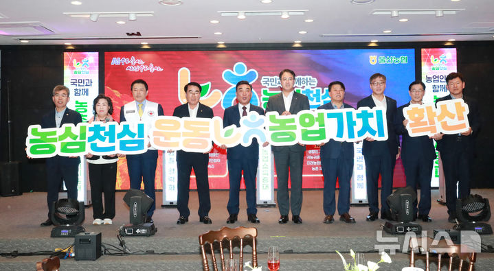 [울산=뉴시스] 배병수 기자 = 농협중앙회 울산본부가 주관한 사랑의 울산쌀 전달 및 농심천심(農心天心) 운동 비전 선포식이 22일 울산시티컨벤션 안다미로홀에서 열린 가운데 김두겸 (왼쪽 다섯번째)울산시장과 이성룡 울산시의회 의장 등 참석자들이 기념촬영을 하고 있다.(사진=울산시 제공)[email protected].