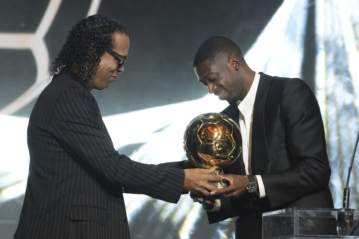 [파리=AP/뉴시스] 파리 생제르맹(PSG)의 우스만 뎀벨레(오른쪽)가 22일(현지 시간) 프랑스 파리 테아트르 뒤 샤틀레에서 열린 제69회 발롱도르 시상식에서 호나우지뉴로부터 2025 남자 발롱도르를 받고 있다. 뎀벨레는 지난 시즌 리그1, 쿠프 드 프랑스(프랑스컵), 유럽축구연맹(UEFA) 챔피언스리그(UCL) 등에서 PSG를 사상 첫 트리플 크라운(3관왕)으로 이끌어 생애 첫 발롱도르를 거머쥐었다. 발롱도르는 세계 최고 권위의 축구 시상식으로, 전 세계 100명의 축구 기자단의 투표로 수상자를 선정한다. 2025.09.23.