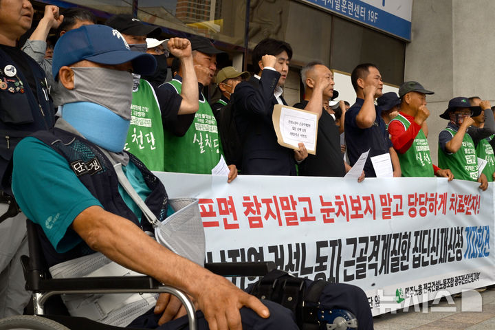 [광주=뉴시스] 이현행 기자 = 민주노총 전국건설노동조합 광주전남건설지부가 23일 오전 광주 서구 근로복지공단 광주지역본부 앞에서 건설노동자 근골격계질환 집단산재 신청 기자회견을 열고 구호를 외치고 있다. 2025.09.23. [email protected]