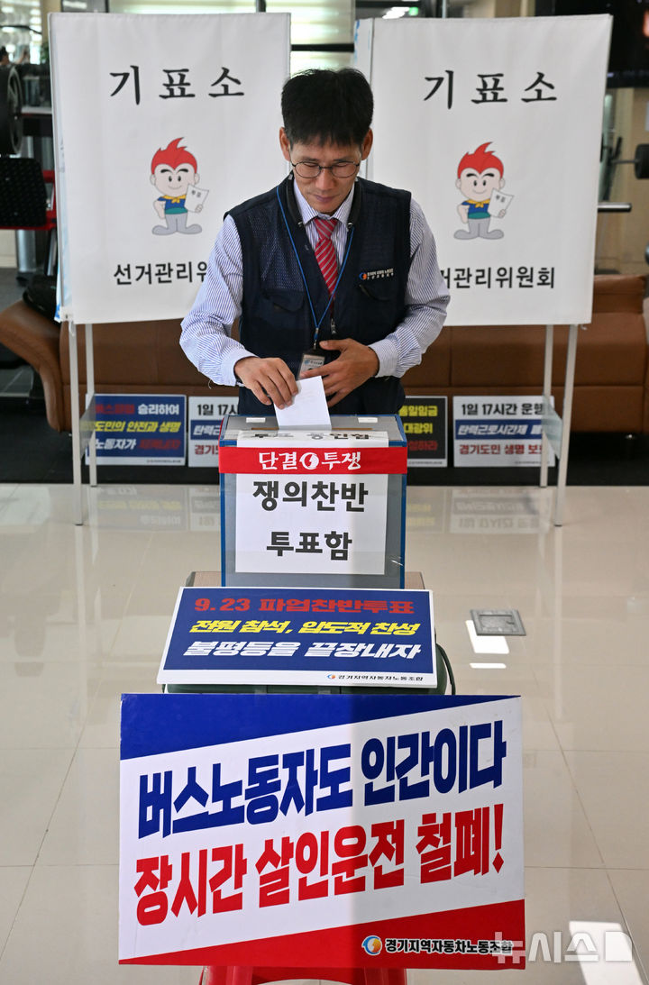 [오산=뉴시스] 김종택 기자 = 경기지역자동차노조(경기버스노조)가 1일2교대제와 임금인상 등을 요구하며 총파업 찬반투표를 실시한 23일 경기 오산시 오산교통에서 조합원들이 투표를 하고 있다.