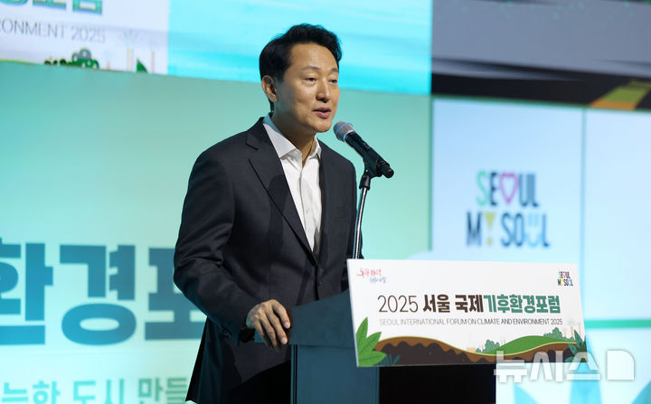 [서울=뉴시스] 김선웅 기자 = 오세훈 서울시장이 23일 서울시청에서 음식폐기물에 대한 실천적 대응, 지속 가능한 도시 만들기를 주제로 열린 2025 서울 국제기후환경포럼에서 개회사를 하고 있다. 2025.09.23. [email protected]