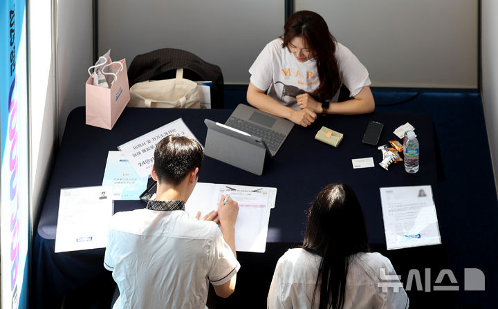 [대구=뉴시스] 이무열 기자 = 23일 대구 수성구 수성알파시티 SW융합테크비즈센터(DNEX)에서 열린 ‘2025 청년 굿잡(GOOD JOB) 일자리 박람회’를 찾은 취업 준비생들이 현장면접을 보고 있다. 2025.09.23. [email protected]