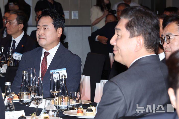 [서울=뉴시스] 김명년 기자 = 장동혁 국민의힘 대표와 김병기 더불어민주당 원내대표가 23일 오후 서울 여의도 페어몬트호텔에서 열린 KBC 광주방송 창사 30주년 기념식에 참석해 있다. 2025.09.23. [email protected]