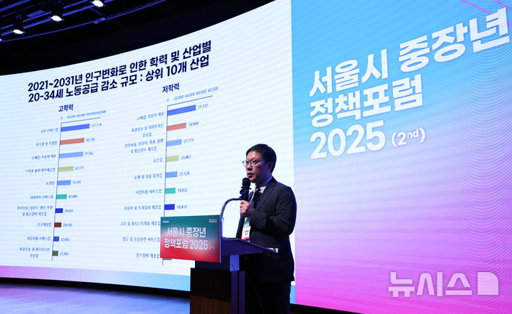 [서울=뉴시스] 최진석 기자 = 이철희 서울대학교 경제학부 교수가 23일 서울 중구 대한상공회의소 국제회의장에서 서울시 주최, 서울시50플러스재단 주관으로 열린 '서울시 중장년 정책포럼 2025'에서 인구변화의 노동시장 충격과 서울시의 중장년일자리 정책을 주제로 기조강연하고 있다. 2025.09.23. [email protected]