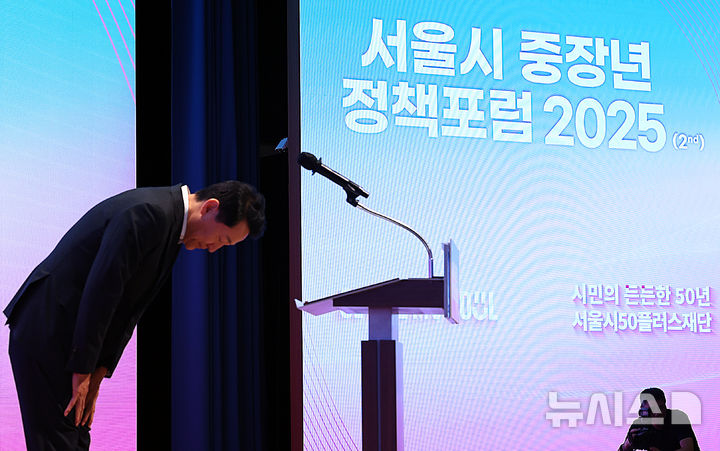 [서울=뉴시스] 최진석 기자 = 오세훈 서울시장이 23일 서울 중구 대한상공회의소 국제회의장에서 열린 '서울시 중장년 정책포럼 2025'에서 개회사 뒤 인사하고 있다. 2025.09.23. [email protected]