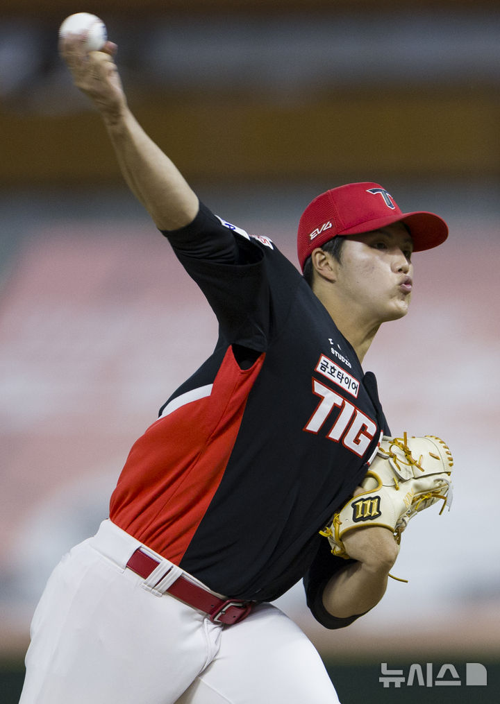 [인천=뉴시스] 김근수 기자 = 23일 인천 미추홀구 SSG랜더스필드에서 열린 2025 KBO리그 KIA 타이거즈와 SSG 랜더스의 경기, 1회말 기아 타이거즈 선발 김태형이 공을 던지고 있다.  2025.09.23. [email protected]