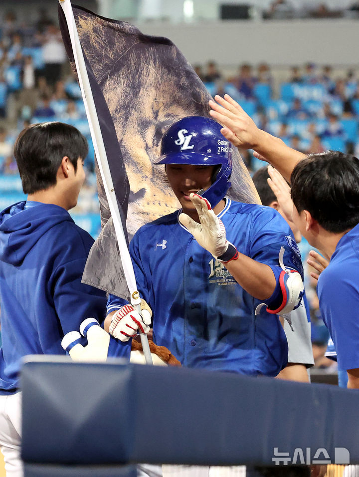 [대구=뉴시스] 이무열 기자 = 23일 대구 수성구 삼성라이온즈파크에서 열린 2025 신한 SOL 뱅크 KBO 리그 두산 베어스와 삼성 라이온즈의 경기, 3회말 1사 1루 상황에서 삼성 이재현이 투런 홈런을 친 뒤 더그아웃에 들어서며 동료들과 기뻐하고 있다. 2025.09.23. [email protected]