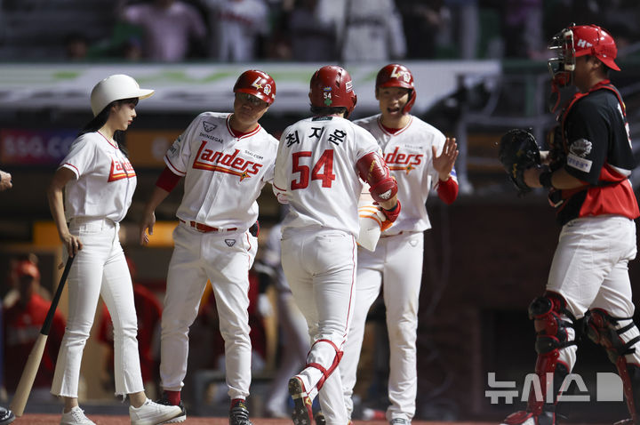 [인천=뉴시스] 김근수 기자 = 23일 인천 미추홀구 SSG랜더스필드에서 열린 2025 KBO리그 KIA 타이거즈와 SSG 랜더스의 경기, 6회말 무사 1루 상황에서 SSG 최지훈이 투런 홈런을 치고 홈 베이스에서 SSG 선수들과 기쁨을 나누고 있다. 2025.09.23. [email protected]