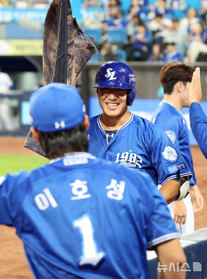 [대구=뉴시스] 이무열 기자 = 23일 대구 수성구 삼성라이온즈파크에서 열린 2025 신한 SOL 뱅크 KBO 리그 두산 베어스와 삼성 라이온즈의 경기, 6회말 1사 주자 없는 상황에서 삼성 이성규가 솔로 홈런을 친 뒤 더그아웃에 들어서며 동료들과 기뻐하고 있다. 2025.09.23. [email protected]