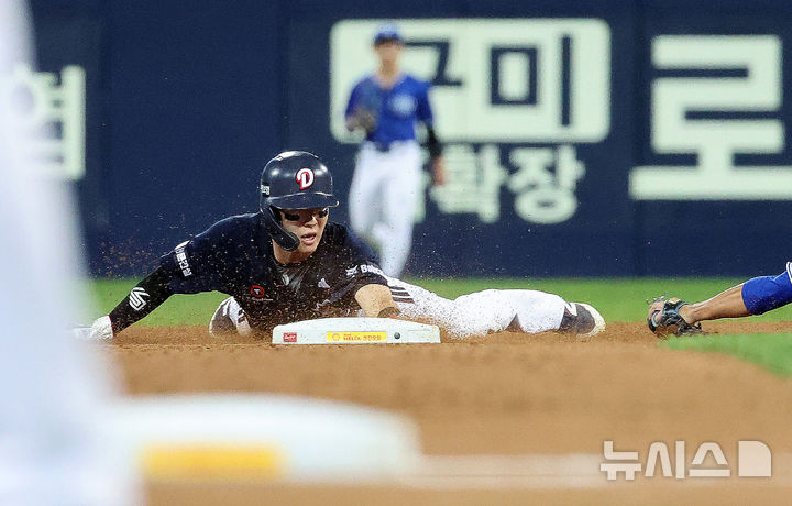 [대구=뉴시스] 이무열 기자 = 23일 대구 수성구 삼성라이온즈파크에서 열린 2025 신한 SOL 뱅크 KBO 리그 두산 베어스와 삼성 라이온즈의 경기, 3회초 1사 1루 상황에서 두산 안재석 타석 때 1루 주자 주수행이 2루 도루에 성공하고 있다. 2025.09.23. [email protected]