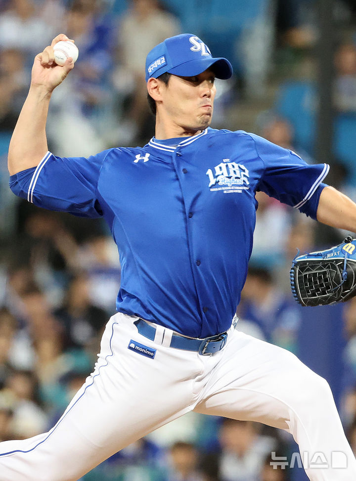 [대구=뉴시스] 이무열 기자 = 23일 대구 수성구 삼성라이온즈파크에서 열린 2025 신한 SOL 뱅크 KBO 리그 두산 베어스와 삼성 라이온즈의 경기, 9회초 삼성 마무리 투수 김재윤이 역투하고 있다. 2025.09.23. [email protected]
