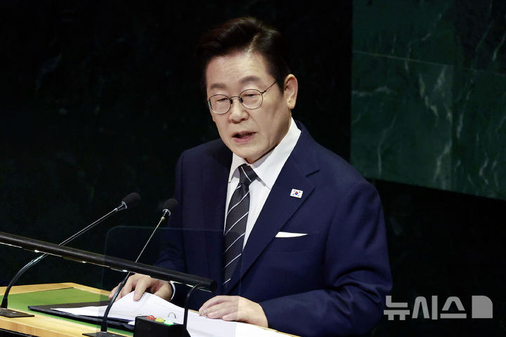 [뉴욕=뉴시스] 최동준 기자 = 이재명 대통령이 23일(현지 시간) 미국 뉴욕 유엔 본부에서 열린 제80차 유엔 총회에서 기조연설을 하고 있다. 2025.09.24. [email protected]