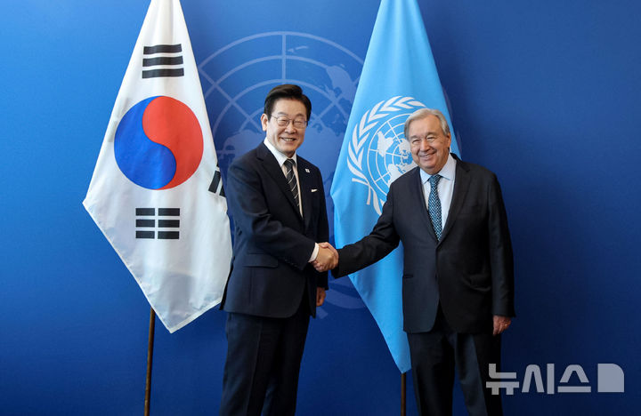[뉴욕=뉴시스] 최동준 기자 = 이재명 대통령이 23일(현지 시간) 미국 뉴욕 유엔 본부에서 안토니우 구테흐스 유엔 사무총장과 악수하고 있다. 2025.09.24. [email protected]