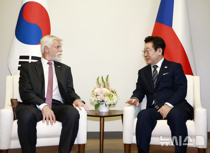 [뉴욕=뉴시스] 최동준 기자 = 이재명 대통령과 페트르 파벨 체코 대통령이 23일(현지 시간) 미국 뉴욕 유엔 본부에서 정상회담을 하고 있다. 2025.09.24. [email protected]