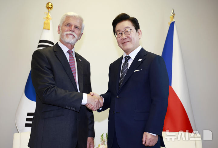 [뉴욕=뉴시스] 최동준 기자 = 이재명 대통령과 페트르 파벨 체코 대통령이 23일(현지 시간) 미국 뉴욕 유엔 본부에서 정상회담에 앞서 기념촬영을 하고 있다. 2025.09.24. [email protected]