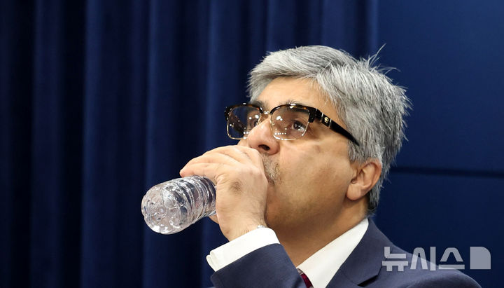 [서울=뉴시스] 추상철 기자 = 라훌 아난드 IMF 한국 미션단장이 24일 오전 서울 종로구 정부서울청사에서 2025년 IMF 연례협의 결과 브리핑에 앞서 물을 마시고 있다. 2025.09.24. [email protected]
