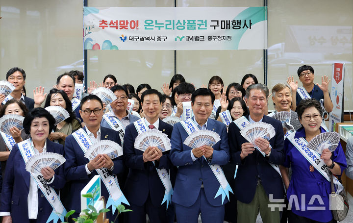 [대구=뉴시스] 이무열 기자 = 24일 대구 중구 iM뱅크 중구청 지점에서 열린 ‘추석맞이 온누리상품권 구매 행사’에서 류규하(가운데) 중구청장을 비롯한 참석자들이 구매한 온누리 상품권을 들어 보이고 있다. 2025.09.24. [email protected]
