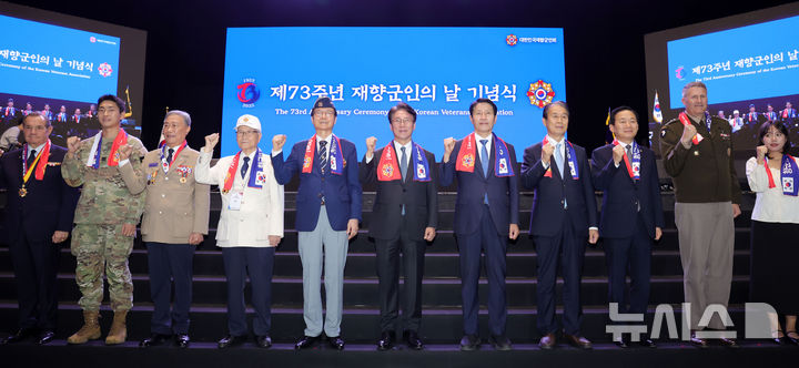 [서울=뉴시스] 홍효식 기자 = 김민석 국무총리가 24일 서울 송파구 올림픽공원 올림픽홀에서 열린 제73주년 재향군인의 날 기념식에서 참석자들과 기념촬영하고 있다. 2025.09.24. [email protected]