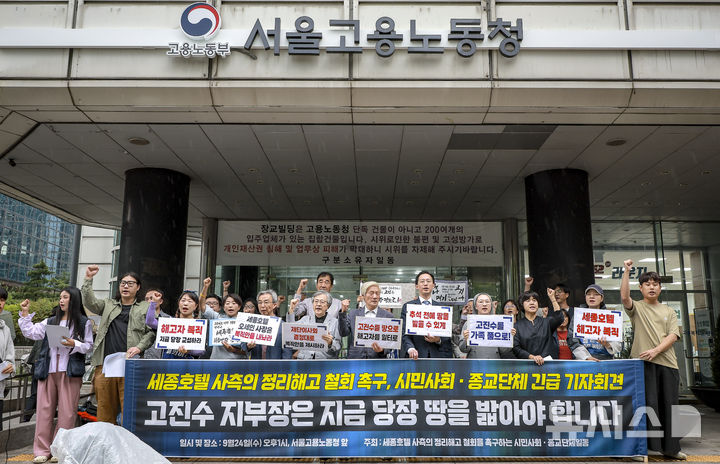 [서울=뉴시스] 정병혁 기자 = 24일 서울 중구 서울고용노동청 앞에서 열린 세종호텔 사측의 정리해고 철회 촉구, 시민사회·종교단체 긴급 기자회견에서 참석자들이 구호흫 외치고 있다. 2025.09.24. [email protected]